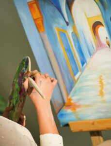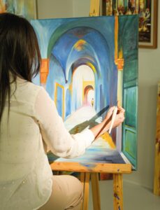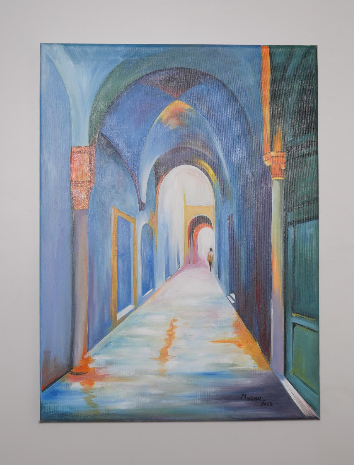 Découvrez cette magnifique peinture représentant un passage bleu profond dans la médina tunisienne. Ce tableau, capture l’atmosphère mystique et mystérieuse des ruelles étroites de la vieille ville. Les arches en pierre, les portes en bois et le long passage bleu créent une ambiance unique et envoûtante. Au loin, la silhouette d’une personne ajoute une touche de mystère à la scène.